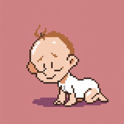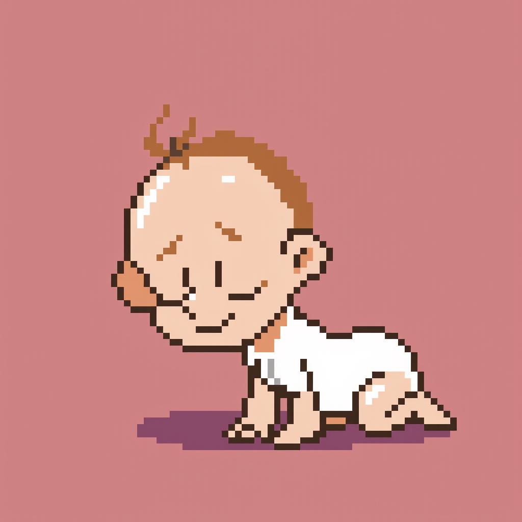 minimalist 2D pixel art character, crawling baby, side-scrolling 3/4 view,, early childhood stage, large head and short body proportions,, baby crawling on hands and knees, slightly turned sideways,, white one-piece baby suit, simple shape, no patterns, no textures,, , clean pixel art style, low detail, solid colors,, soft colored outline instead of black outline,, readable silhouette, simple limbs, chunky proportions,, , calm, gentle mood, neutral expression,, indie pixel art game character, narrative platformer style,, designed as a game sprite, not illustration,, plain background, single character centered,