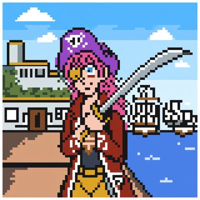 анимешная девушка стоит на ногах на причале. Набережная. Море. В дали парусные корабли. Пиратская повязка на правый глаз. Кривая сабля в руке. динамичная поза. длинные розовые волосы. Голубой глаз. красное пальто с жёлтым узором. Фиолетовая шляпка. Череп и кости нарисованы на шляпе. Чёрный корсет. Чёрные сапоги. молодая трава. весна. В полный рост. 2d, аниме. акварель, маркеры, гуашь, масляные краски, тушь, цветные карандаши, пастель фэнтези. арт, скетч, рисунок