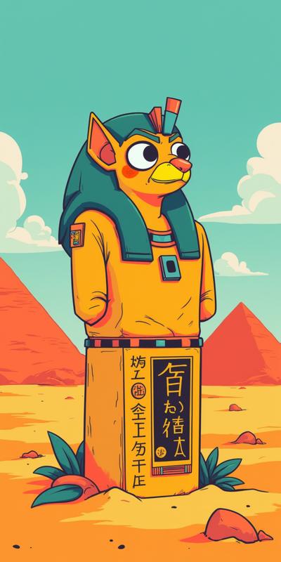 Cartoon-style Egyptian god Horus, stone statue with a stylized falcon head, friendly and heroic expression, sitting on a pedestal, colorful Egyptian desert background with pyramids, subtle hieroglyphs on the base, whimsical and playful, bright vibrant colors, clear stone texture visible, stylized shadows, perfect for a slot game, high detail, engaging character design”