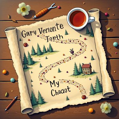 Причудливая и уютная рукописная карта на мятой пергаментной бумаге, лежащая на деревянном столе рядом с чашкой чая. На карте изображен извилистый путь через дружелюбный лес. Один конец пути помечен как "Мой Хаос" с рисунком запутанного клубка ниток. На другом конце изображен уютный домик с сердечком на крыше, подписанный "Моя Цель". Вдоль пути стоят маленькие милые указатели, например: "Кафе Маленького Шага", "Место для Отдыха", "Гостиница Первого Предложения". Стиль рисунка — теплый, inviting, с юмором и легкой неидеальностью, как личный скетч. Мягкое утреннее освещение, приглушенные натуральные цвета (шалфейный, терракотовый, кремовый). Стиль съемки сверху