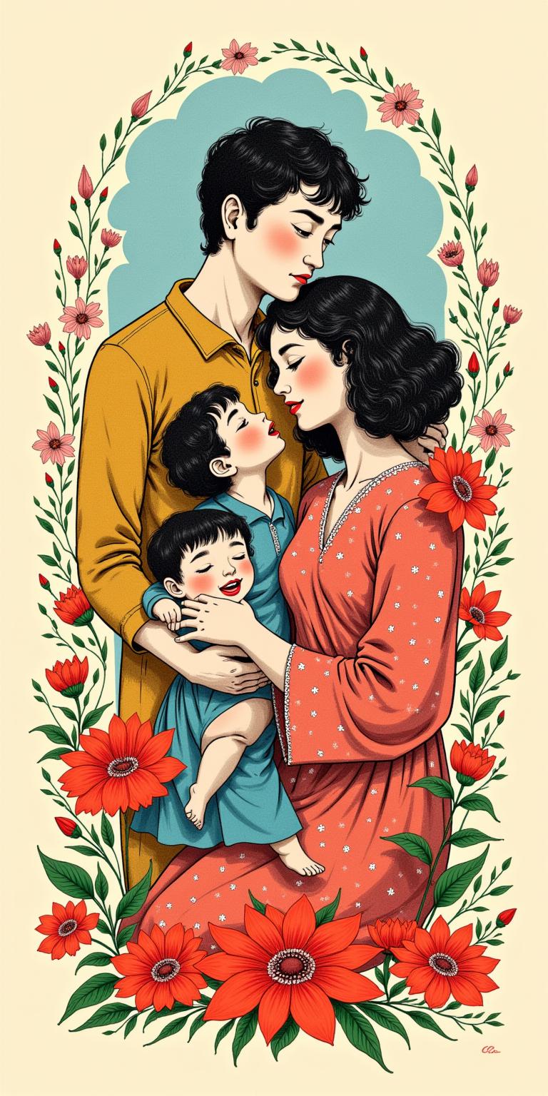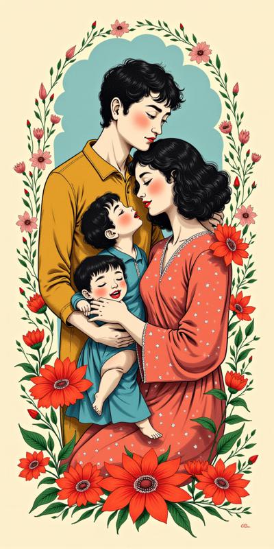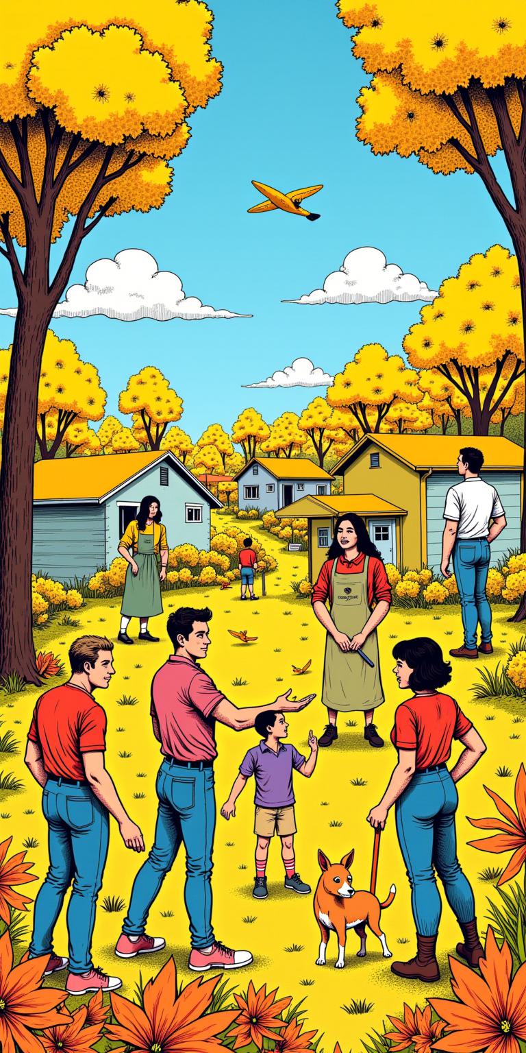 A vibrant collage illustrating community and nature, featuring diverse individuals engaged in daily activities. Bright sunshine illuminates the scene, highlighting lush yellow foliage and a blue sky. The composition is vertical, showcasing elements like a worker with tools, a homemaker, and joyous children playing. Floral motifs, particularly daisies and tulips, add a touch of color and warmth. The style is reminiscent of retro illustration, characterized by bold colors and clear lines. The focus is on harmony and labor, depicting a strong sense of togetherness and vitality in a lively outdoor setting.