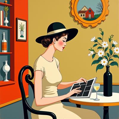 АБСТРАКТНАЯ ЖИВОПИСЬ . АБСТРАКТНАЯ ЖЕНЩИНА АРИСТОКРАТИЧНОЙ ВНЕШНОСТИ НАРИСОВАННАЯ В СТИЛЕ КАРТИН Jack Vettriano, СИДИТ В ПРОФИЛЬ В КАФЕ ЗА СТОЛОМ В КРЕМОВОМ ЛЕТНЕМ ПЛАТЬЕ И В ШЛЯПЕ В ФОРМЕ ВЕДРА МОДЫ 19050 ГОДА И ЧИТАЕТ ЖУРНАЛ, ЛЕЖАЩИЙ НА СТОЛЕ . НА СТОЛЕ БУТЫЛКА ВИНА, БОКАЛ И ВАЗА С БЕЛЫМИ ЦВЕТАМИ . ФОН КАРТИНЫ ОКНО ИЗ КАФЕ С СОВРЕМЕННЫМИ ДЕКОРАТИВНЫМИ ЖАЛЮЗЯМИ