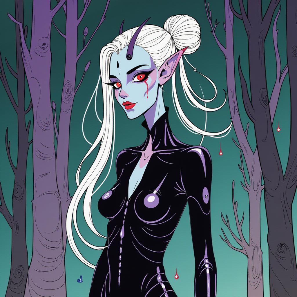 full body portrait of Zin'atra "The Dagger's Smile", a drow elf with refined beauty and theatrical grotesquery. Polished obsidian skin with dark amethyst sheen, dazzling long white hair in a messy bun with stray strands. Bright scarlet eyes with an unnatural, obsessive glow. Features are elegant but distorted by a constant play of emotions. Face covered in thick white powder, with dark purple painted lips stretched in a wide, unnatural smile. Wearing an elegant but worn purple doublet over reinforced leather armor, moving with precise, stage-like grace. Dark fantasy, intricate details, hyperrealistic, dramatic lighting, trending on ArtStation.