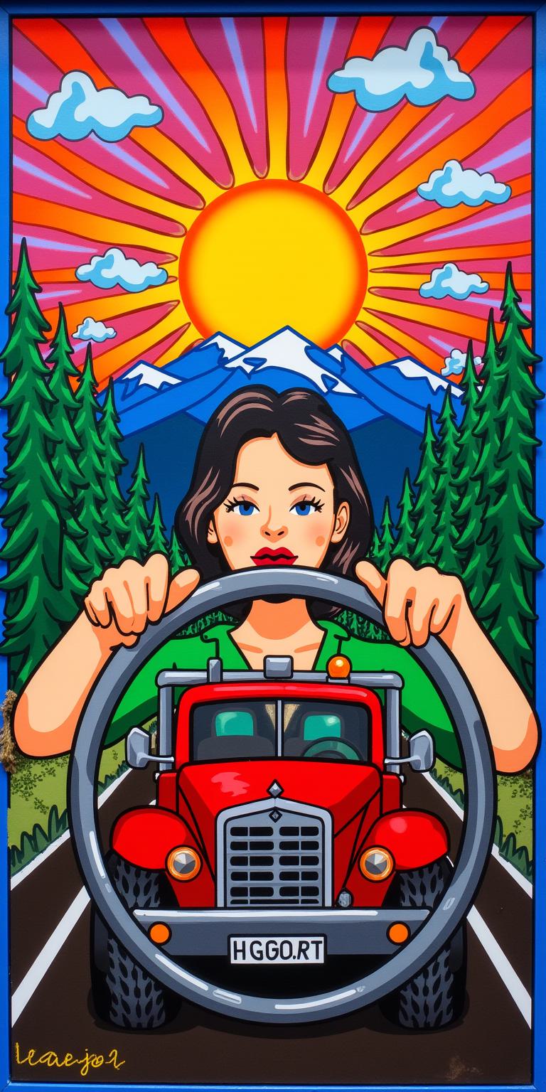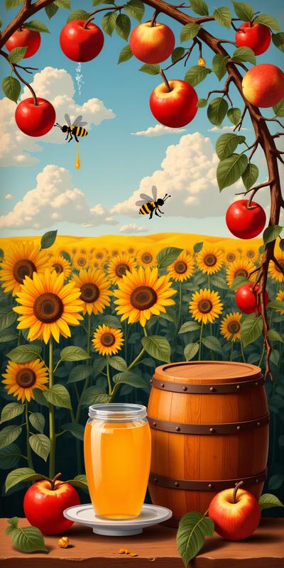 A vibrant collage illustrating community and nature, featuring diverse individuals engaged in daily activities. Bright sunshine illuminates the scene, highlighting lush yellow foliage and a blue sky. The composition is vertical, showcasing elements like a worker with tools, a homemaker, and joyous children playing. Floral motifs, particularly daisies and tulips, add a touch of color and warmth. The style is reminiscent of retro illustration, characterized by bold colors and clear lines. The focus is on harmony and labor, depicting a strong sense of togetherness and vitality in a lively outdoor setting.