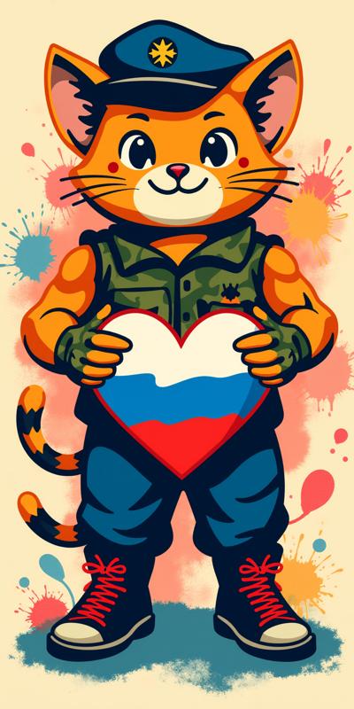 антропоморфный кот с выраженной мускулатурой. Кот одет в тельняшку и голубой берет, на лапах — камуфляжные перчатки. Он держит перед собой сердце, раскрашенное в цвета российского триколора (белый, синий, красный), символизирующее любовь к Родине. Фон открытки — динамичный, с абстрактными брызгами краски (преобладают красный, белый и синий цвета),