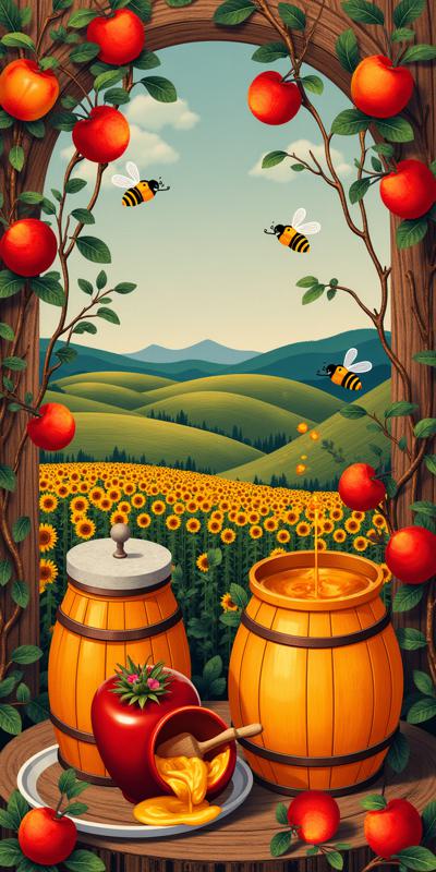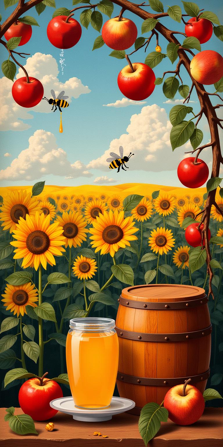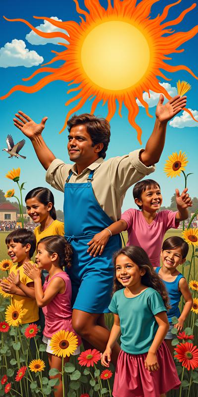 A vibrant collage featuring diverse characters engaged in various activities under an exuberant sunlit sky. Subjects include a man in a blue apron, women in traditional attire, joyful children, and a soaring bird symbolizing freedom. The setting blends rural and urban elements, surrounded by abundant yellow foliage, adding depth and warmth. The artwork employs a rich color palette and dynamic composition, highlighting both the emotional connection among the figures and their environment. The style reflects a blend of vintage illustration with a modern twist, evoking nostalgia while celebrating community and nature. Light streams brightly, creating a cheerful and uplifting mood.