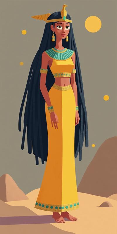 A full-body 2D cartoon Cleopatra character as a slot game high-pay symbol. She stands upright, facing forward, regal and elegant. Cleopatra has long braided hair with beads, styled in thin braids/dreads. On her head she wears a striped golden and turquoise crown with a falcon motif, wings lowered along the sides. She is dressed in a golden gown with turquoise accents, adorned with jewelry, beaded collar, and bracelets. Her facial expression is gentle and kind, with a soft smile. Framed with a golden decorative border with turquoise gems. Cartoon, colorful, polished 2D style, smooth shading, shiny highlights. Transparent background.,