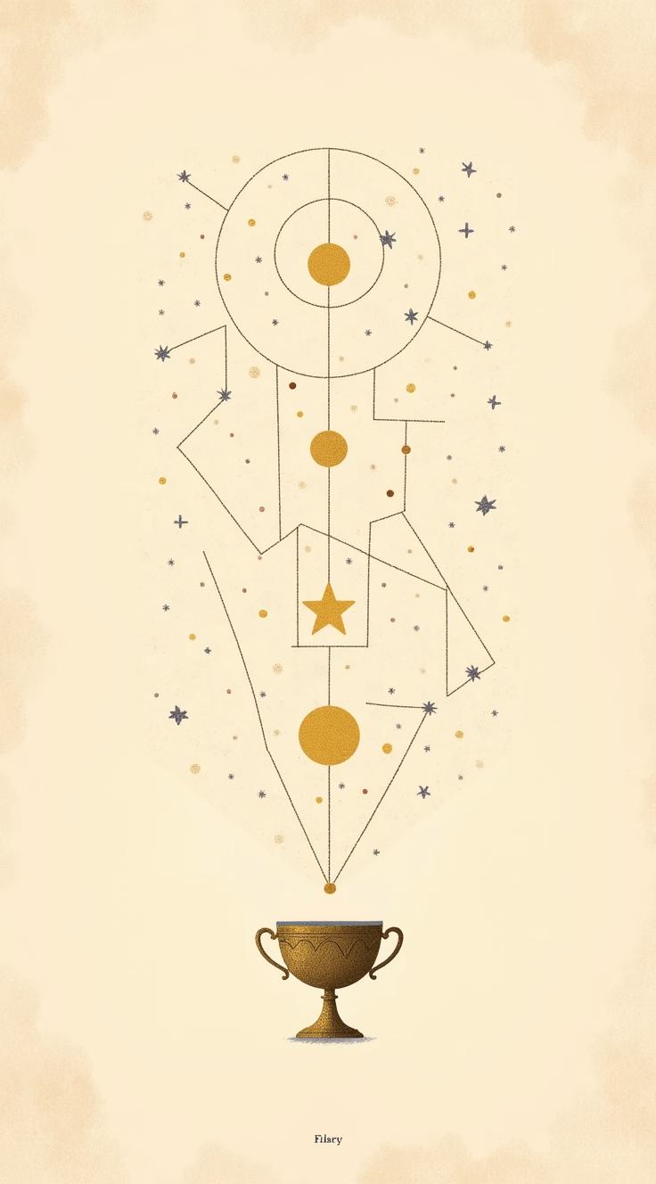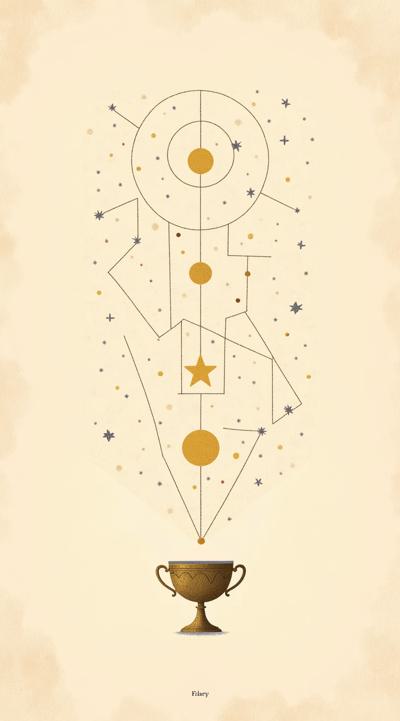 Дизайн рубашки для колоды Таро в стиле "минимализм". Светло-бежевый фон, как старинный пергамент. На нем тонким коричневым контуром изображены астрономические элементы: рассыпанные звезды, соединяющиеся в созвездия, а также стилизованный античный кубок. Все элементы переплетены ажурной паутиной геометрических линий, создавая ощущение тайны и гармонии. Высокая детализация, монохромная палитра.