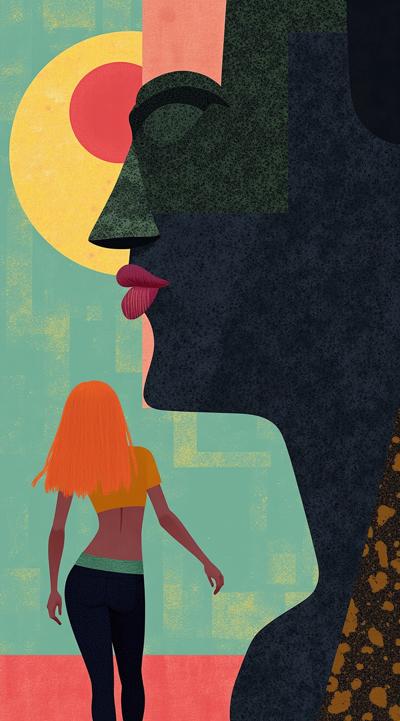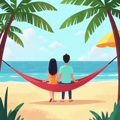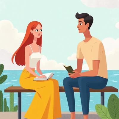 Девушка и парень разговаривают друг с другом, сидя на лавочке на набережной. Девушка: красивая, с длинными ярко-рыжими волосами, одета в белую майку на тонких бретелях и длинную, до земли, жёлтую юбку. В руках у девушки книга. Парень: красивый, широкоплечий брюнет, одет в синий спортивный костюм, рядом с ним на скамейке стоит спортивная сумка "адидас". На фоне: летний солнечный день, деревья, парк. Рисунок в жанре современный любовный роман.