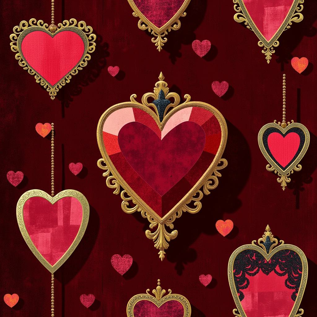 Seamless pattern, vintage French cancan inspiration, Moulin Rouge style. Background of rich deep red velvet texture. Overlaid with ornate golden frames of different sizes, inside each frame is a stylized shiny heart made of faceted ruby gemstones and black lace. Scattered between frames are small sparkling diamonds and tiny champagne bubbles. Elegant, luxurious, decorative, repeating pattern, high quality, 8k, vector art style.