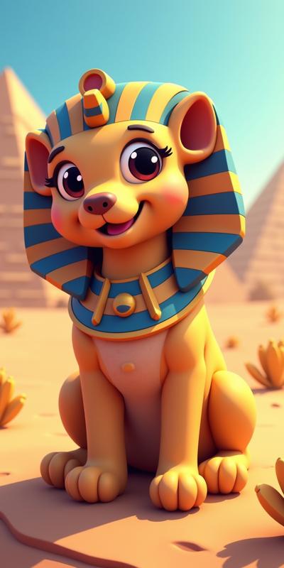 Cartoon-style stone Egyptian sphinx, made of textured sandstone, slightly stylized and exaggerated features, friendly and playful expression, sitting in a colorful desert with pyramids in the background, whimsical and vibrant, clear stone texture visible, fun and engaging character design for a slot game, bright colors, stylized shadows, high detail”