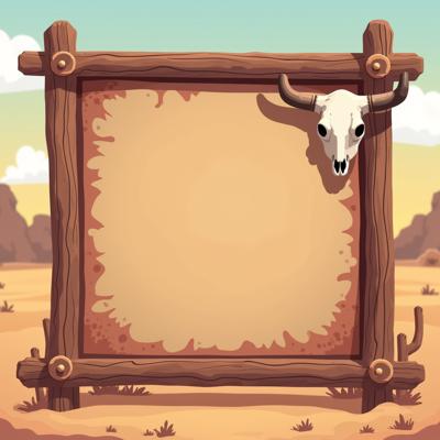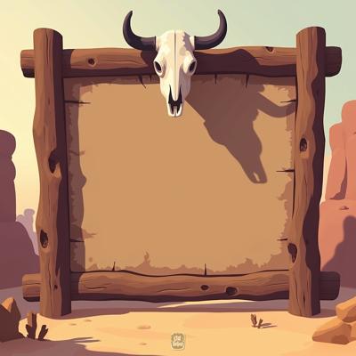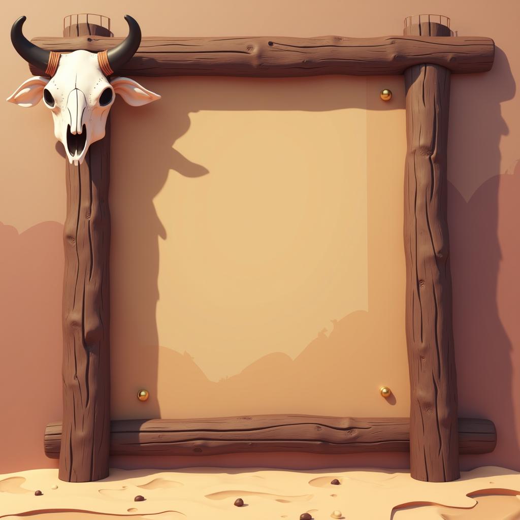 Фон игрового поля для слот-игры в стиле Дикого Запада, деревянная доска розыска в качестве основной рамки, слегка старый и потёртый вид, на одном углу висит коровий череп, с боку воткнуты две маленькие колышки, тёплая пустынная цветовая палитра, реалистичная текстура дерева, лёгкие тени, пустое пространство для барабанов, винтажная вестерн-атмосфера, детально, но не перегружено, кинематографическое освещение, высокое разрешение