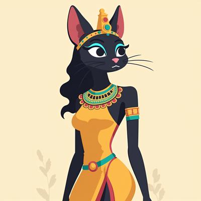 A full-body 2D cartoon Bastet, the Egyptian cat-headed goddess, in 3/4 view, slightly turned to the side. She has a sleek cat head instead of a human face and a woman’s body. She wears a golden-turquoise crown, wide beaded collar, ornate bracelets, and a golden dress with turquoise and red details. In one hand she holds a sistrum, in the other an ankh. Her cat head is regal, with stylized eyeliner. Soft, hand-drawn 2D style, bright and vibrant, perfect for a fantasy slot game. Simple or transparent background.