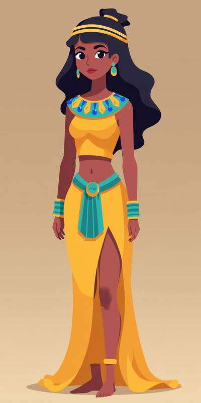 A full-body 2D cartoon Cleopatra character in ancient Egyptian royal attire, designed as a slot game high-pay symbol. Cleopatra is standing upright, facing forward, with a graceful and majestic pose. She wears a golden dress with turquoise and blue accents, decorated with jewelry, wide beaded collar, golden bracelets, and a traditional cobra crown (uraeus). Her facial expression is gentle and kind, with a soft smile. The character is framed by a decorative golden border with turquoise accents, making her stand out as a high-value symbol. Art style: soft, colorful, hand-drawn 2D, smooth shading, shiny highlights, no 3D realism. Transparent background.