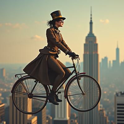 СРЕДНЕВЕКОВАЯ КЛАССИЧЕСКАЯ ЖИВОПИСЬ . ФОН КАРТИНЫ ЕДВА ПРОСМАТРИВАЮЩЕСЯ СКВОЗЬ ДЫМКУ НЬЮ ЙОРКСКИЙ ЭМПАИР БИЛДИНГ И ДРУГИЕ НЕБОСКРЕБЫ . ЖЕНЩИНА ОДЕТАЯ В АВИА НАРЯД В СТИЛЕ СТИМПАНК С ОЧКАМИ В СТИЛЕ СТИМ ПАНК С ВЫСОКИМ ЦИЛИНДРОМ В ПОЛОСКУ И ЗАВИСШАЯ В НЕБЕ НА ВЕЛОСИПЕДЕ 19 ВЕКА ПРИСОЕДИНЕННЫЙ К НЕБОЛЬШОМУ ДИРИЖАБЛЮ В ПРОФИЛЬ . РЯДОМ ПРОЛЕТАЕТ БОЛЬШАЯ УДИВЛЕННАЯ СЕРО ЧЕРНАЯ ВОРОНА