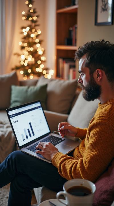 Книга про продвижение сайтов в Яндексе. Название крупно вверху: «Поведенческий фактор: как подружиться с Яндексом и вывести сайт в ТОП». Уютная домашняя обстановка: человек в удобном свитере сидит с ноутбуком на диване, рядом кружка с чаем. На экране ноутбука — график роста и надпись «ТОП-3». Из ноутбука поднимается вверх теплый золотистый свет, создавая ощущение волшебства и успеха. Фон мягкий, спокойный, вечерние огни за окном. Стиль: современный, добрый, вдохновляющий. Никакой агрессии, только уют и позитив. Шрифт названия крупный, дружелюбный, теплых тонов.