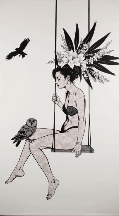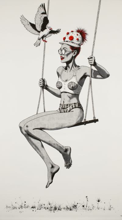 живопись в стиле минимализм, пейзаж,абстрактная живопись, которая демонстрирует в стиле Jack Vettriano, МНОГО ПЕРСОНАЖНОЙ КОМПОЗИЦИИ В ВИДЕ переплетения БЕЛО-МРАМОРНОЙ ГИППЕРРЕАЛИСТИЧНОЙ ВЕКТОРНОЙ ГРАФИКИ , фигур и объектов. ЖЕНЩИНА С ЭКЗОТИЧЕСКОЙ ПРИЧЕСКОЙ РЫБЫ-КЛОУНА НА КАЧЕЛЯХ И ЛЕТЯЩЕЙ СОВОЙ переплетения БЕЛО-МРАМОРНОЙ ГИППЕРРЕАЛИСТИЧНОЙ ВЕКТОРНОЙ ГРАФИКИ , фигур и объектов намекая на борьбу с ЖЕНСКИМ подсознанием сюжета. Работы представлены в сюрреалистической перспективе, иллюстрируя ЛОШАДИНЫЙ полет, вызванный генерацией подсознательной сублимации сознания, в реконструкцию переосознания реальности в ином измерении.