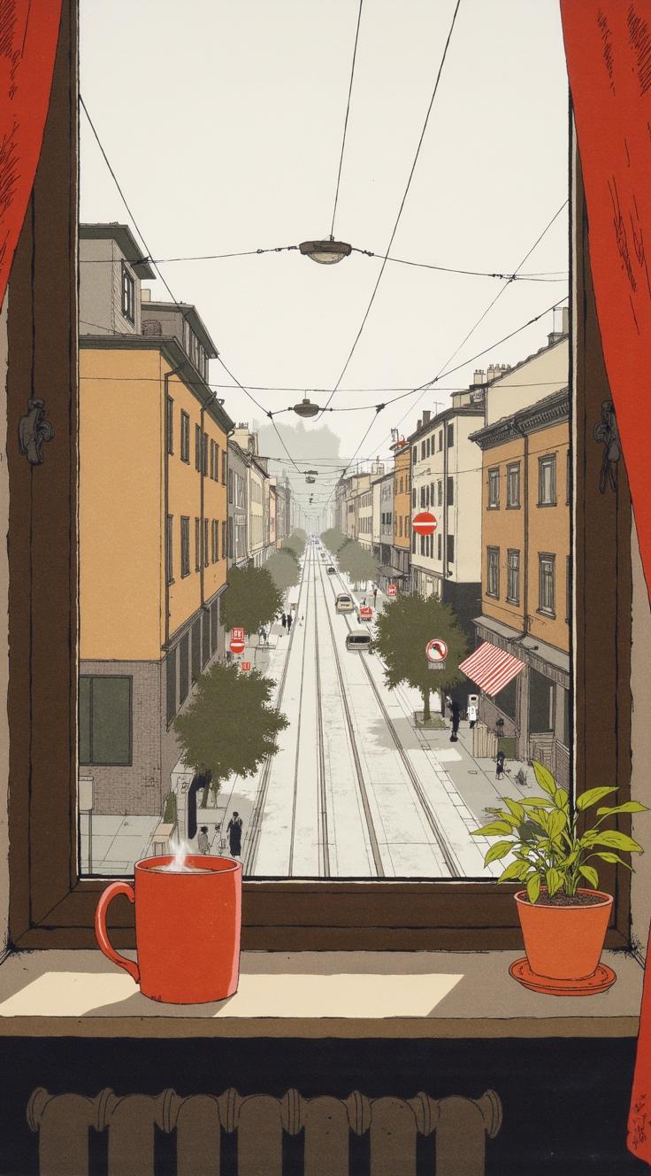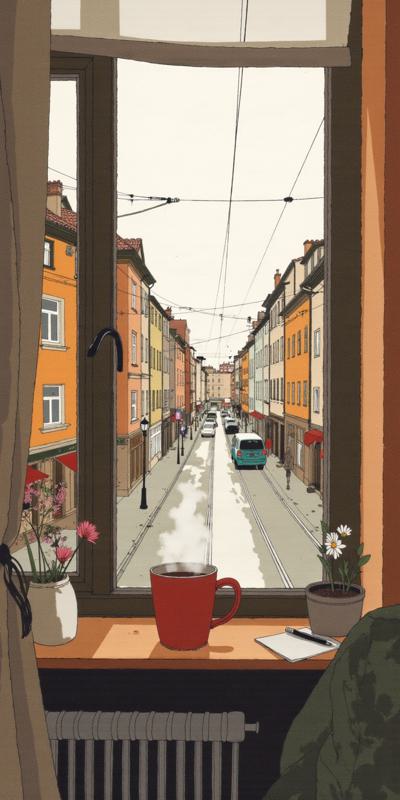 реклама , Обложка книги «Хроники Здесь и Сейчас. Том первый». Мягкий акварельный стиль, тёплые приглушённые тона. Уютная городская квартира в спальном районе России, утро. Вид из окна на панельные дома, трамвайные пути, мокрый асфальт после дождя. На подоконнике — старая кружка с чаем, пар поднимается к стеклу. Занавеска колышется от ветра. На стене — тёплый свет лампы, тени, фотографии в рамках. Книга, раскрытая на подоконнике. Чувство покоя, замедления, домашнего уюта. Без людей. Мягкий свет, акварельная дымка, лёгкая меланхолия, но без грусти. Формат для печатной книги. чтобы текст читался хорошо,