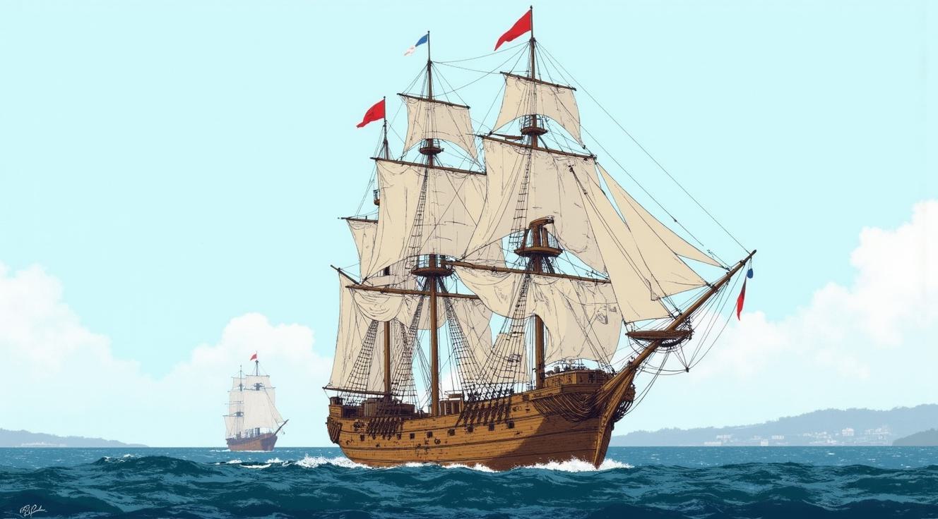 НАРИСУЙ 2 Парусных фрегата XVIII–XIX веков , это быстроходный трехмачтовый военный корабль с полным парусным вооружением. Характеристики включали водоизмещение 1000–2000 тонн, длину 40–50 м, ширину 11–13 м и вооружение из 24–50 орудий 24-фунтовые пушки, с экипажем 300–450 человек. НА МОРЕ СРЕДНЕЙ ВОЛНИСТОСТИ ПАЛИТРА МОРСКОЙ ВОДЫ БЕЛЫЕ ОХРОВЫЕ УМБРОВЫЕ КОРИЧНЕВЫЕ СЕРЫЕ ЦВЕТА,
