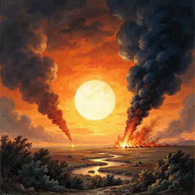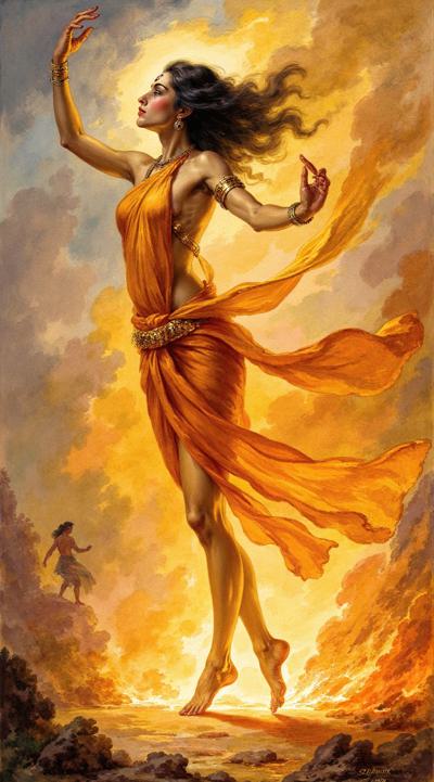 Экстатический танец индийской богини в огне. Её фигура, стройная и гибкая, почти угадывается сквозь потоки струящегося золотого мёда и развевающиеся шелка сари. Мистическая аура, третий глаз на лбу. Её ступни и тонкие ноги детально прорисованы. Фон — размытое пламя и силуэты склонённых фигур. Драматичное освещение, атмосферно, в стиле фэнтези-арт, работа Грега Рутковски.