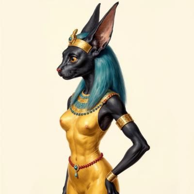 A full-body 2D cartoon Bastet, the Egyptian cat-headed goddess, in 3/4 view, slightly turned to the side. She has a sleek cat head instead of a human face and a woman’s body. She wears a golden-turquoise crown, wide beaded collar, ornate bracelets, and a golden dress with turquoise and red details. In one hand she holds a sistrum, in the other an ankh. Her cat head is regal, with stylized eyeliner. Soft, hand-drawn 2D style, bright and vibrant, perfect for a fantasy slot game. Simple or transparent background.