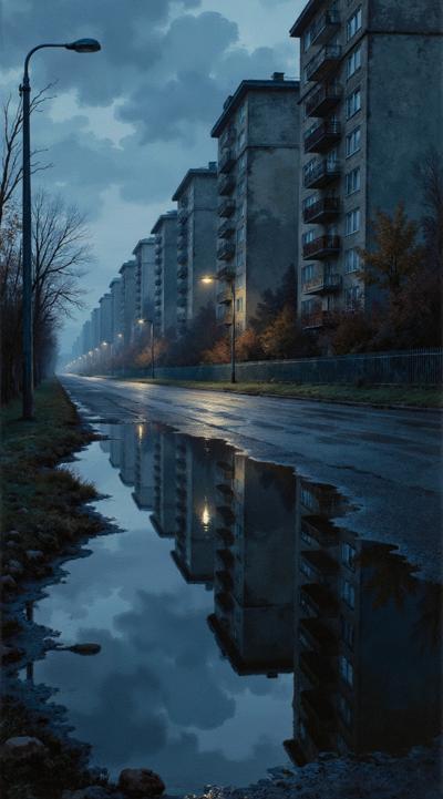A puddle on the asphalt in a soviet-era residential district, reflecting the gloomy facade of an apartment building on a rainy autumn evening, russian city, close up, dark night, the bright in few windows, focus on the reflection in the puddle, cinematic film noir, style of David Fincher, heavy film grain, anamorphic lens distortion, the reflection is slightly blurred by rain ripples, colors are muted and cold, wet textures, gritty and realistic, dramatic shadows, sense of voyeurism --ar 21:9 --no clean, happy