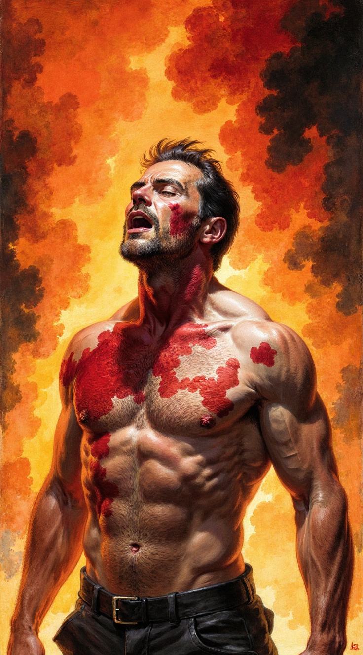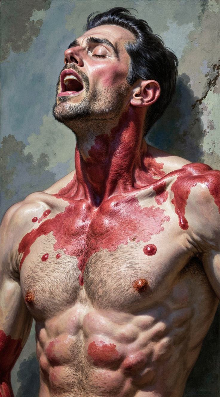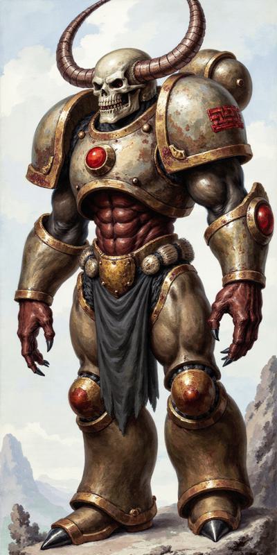 Malgaar the Ironmaw – a towering Chaos Space Marine in rust-eaten, fused Iron Hands armor. Half his face is a bare metallic skull with a red targeting lens; the other half is pallid, decaying flesh. His armor is a symbiosis of living metal and rotting plague, pulsing with bioluminescent sores. One arm is a biomechanical claw dripping acid. He wields Logical Paradox, a chainsword weeping techno-virus. No helmet – instead, his skull is networked with grimy cables. Posture is unnervingly still, cold, calculating. The air around him shimmers with flies and corrosion.