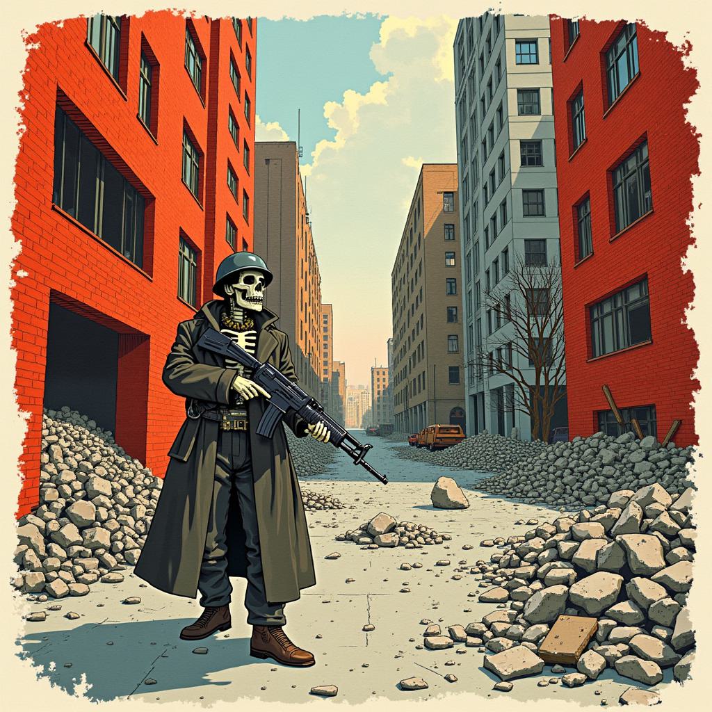Иллюстрация: Воин-скелет в каске, шинели и с винтовкой в руке, стоит среди обломков кирпичных зданий и разрушенных уличных баррикад современного города. Стиль: винтажная советская иллюстрация (60-80-е), густая черная обводка, плоские акварельные цвета, минимум теней, наивная прорисовка. Эффект вырезки из старого журнала на пожелтевшей бумаге с неровными краями.”