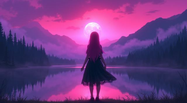 A gothic girl stands by a still lake at twilight, full figure visible. She wears a black lace-trimmed dress, velvet texture, black shoes, long straight magenta-rose hair (no bangs), mossy-green eyes with dark eyeliner. She gazes toward misty mountains under a vivid pink-violet sunset. The mirror-like water reflects sky and peaks. Lavender haze softens distant slopes. Rich details in fabric folds, hair strands, water ripples. Romantic, solitary mood. She stands slightly turned to the viewer, centered, her silhouette faintly glowing in dusk light. Entire figure fits within the middle third of the image, surrounded by a dreamy, poetic landscape.