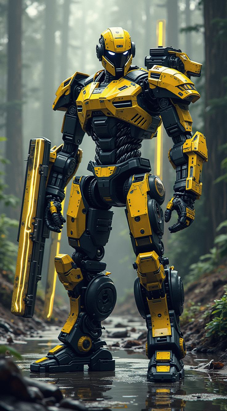 Чёрно-стальной робот с моно лидаром жёлтого голографического оттенка, размер робота примерно 6 метров, смотрит прямо на камеру, на спине огромный длиннодревковый молот выполненый в тона робота а дробящий конец молота плоский и отдаёт жёлтым свечением. В левой руке робота щит больше его самого на 2 метра