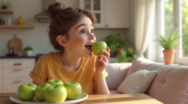 Фотография в лайфстайл-стиле. На переднем плане — молодая женщина с чуть полноватой фигурой, сидит в уютной домашней обстановке или на улице. Она с радостью и лёгкостью откусывает сочное зелёное яблоко, улыбается, выглядит энергичной и довольной. Атмосфера лёгкости и здоровья, ощущение, что она наслаждается простыми и правильными привычками. Свет мягкий, естественный. Цветовая гамма — светлые, тёплые оттенки. Без текста.
