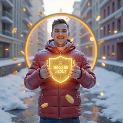 `Aspirational Omsk ad visual. Triumphant Omsk resident (gender-neutral, smiling) holds glowing abstract "reward" (stylized shield/coin) with "10,000 ₽". Background: blurred Omsk winter cityscape/river. From stylized portal: stream of gold coins, financial charts upwards, hint of guiding Siberian bear. Elegant Alfa-Bank logo as opportunity source. Palette: clean, bright positive colors (golds, blues, white). Soft atmospheric lighting. Modern advertising illustration, inviting