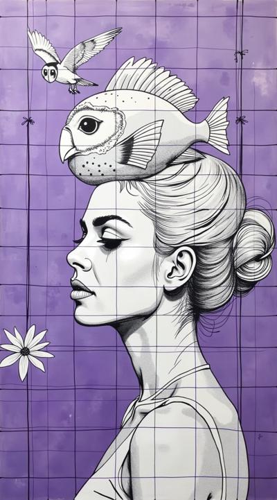 живопись в стиле минимализм, пейзаж,абстрактная живопись, которая демонстрирует в стиле Jack Vettriano, МНОГО ПЕРСОНАЖНОЙ КОМПОЗИЦИИ В ВИДЕ переплетения БЕЛО-МРАМОРНОЙ ГИППЕРРЕАЛИСТИЧНОЙ ВЕКТОРНОЙ ГРАФИКИ , фигур и объектов. ЖЕНЩИНА С ЭКЗОТИЧЕСКОЙ ПРИЧЕСКОЙ РЫБЫ-КЛОУНА НА КАЧЕЛЯХ И ЛЕТЯЩЕЙ СОВОЙ переплетения БЕЛО-МРАМОРНОЙ ГИППЕРРЕАЛИСТИЧНОЙ ВЕКТОРНОЙ ГРАФИКИ , фигур и объектов намекая на борьбу с ЖЕНСКИМ подсознанием сюжета. Работы представлены в сюрреалистической перспективе, иллюстрируя ЛОШАДИНЫЙ полет, вызванный генерацией подсознательной сублимации сознания, в реконструкцию переосознания реальности в ином измерении.