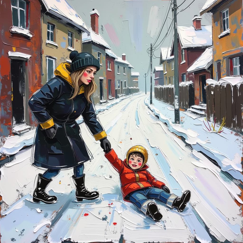 Обложка сингла без текста. Абстрактная упрощённая экспрессионистская зарисовка серой сажей и маслом на холсте в стиле гранж и пост‑рок. Сцена: зима в российском городке ранним утром (ещё темно), мама силком тащит лежащего на снегу сына за руку. Шуточный тон. Сугробы, холод, городские просторы и природа на фоне. Соотношение сторон 1:1.