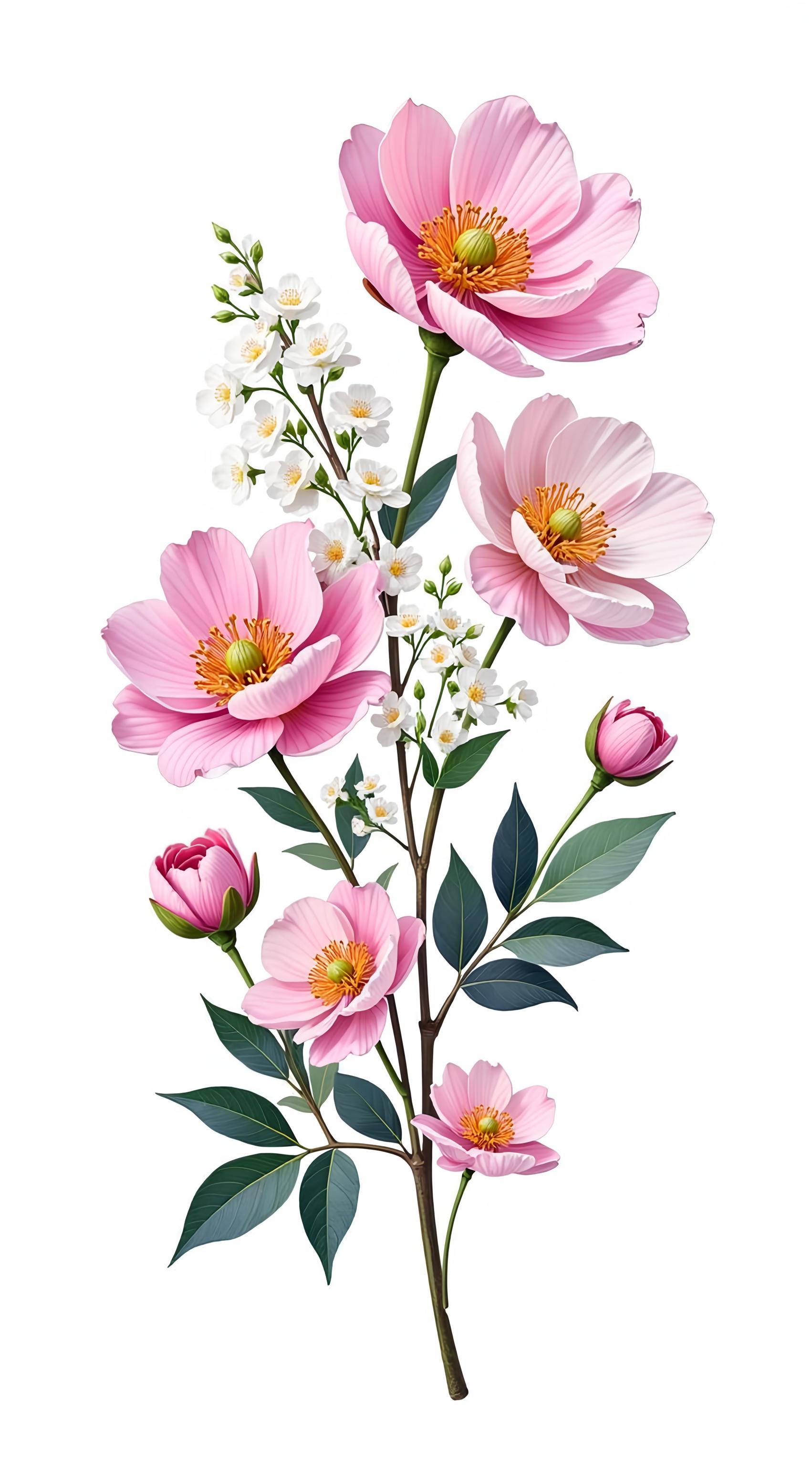 Фотография научного ботанического образца, выделенного на ярко-белом фоне. Точная композиция: семь розовых пионов, две веточки белой сирени, листья эвкалипта и веточка мелких белых цветов гипсофилы. Макрообъектив, сверхдетализированный, видна каждая жилка и текстура лепестков и листьев. Ровное освещение без теней, чистые цвета. Никаких винтажных эффектов, никакой текстуры, никакой зернистости. --ar 2:3 -v 6.0