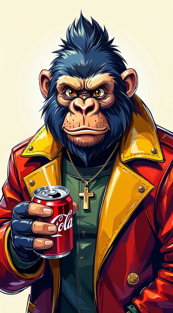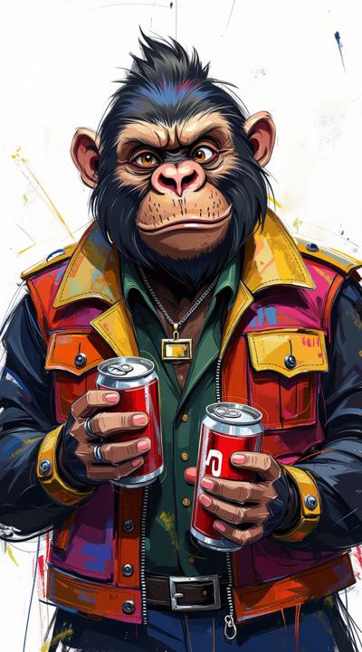 Фотореалистичный портрет гориллы,грозный вид, в стильной разноцветной желете, держит в руках металлическую банку колы. смотрит в камеру, яркий фон. Мягкий контровой свет, реалистичные отражения на банке, детализированная текстура меха и кожи куртки, выражение лица уверенное и харизматичное, полупрофиль по пояс, малая глубина резкости (размытый фон), насыщенные, естественные цвета, высокая детализация, 4k, 85mm, f/1.8
