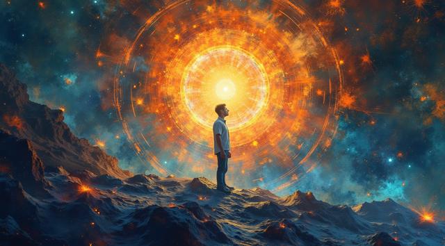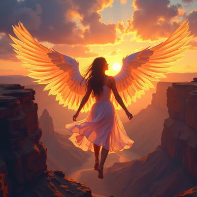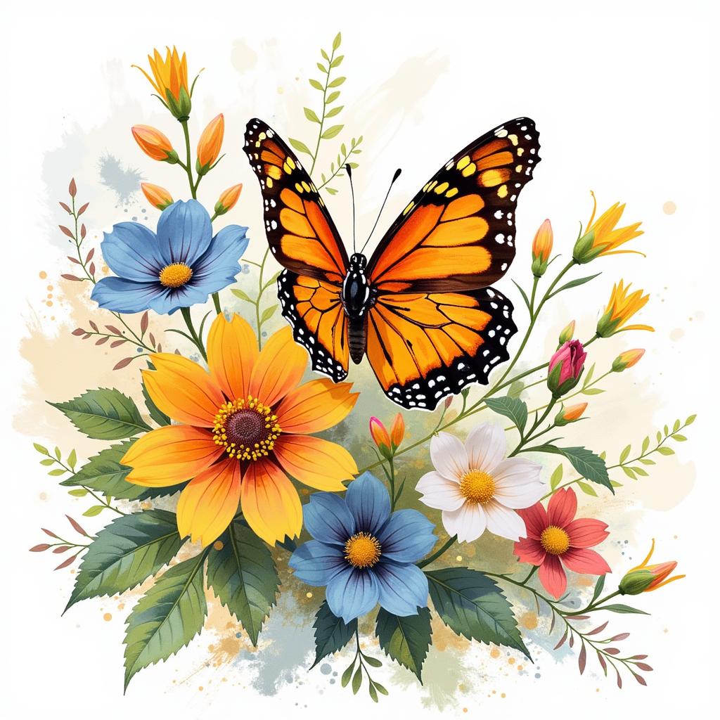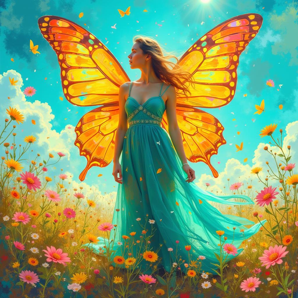 Фэнтезийный портрет в полный рост: женщина в образе феи-бабочки, стоит в поле цветов под бирюзовым небом. На ней гигантские полупрозрачные крылья, сияющие оранжево-жёлтыми переливами, словно витраж. Бирюзовое глянцевое платье с широкой прозрачной юбкой, украшенной розовыми и жёлтыми цветами. Бирюзовые шнурованные полусапоги с цветочным декором. Макияж сияющий, губы красные, глянцевые. Голова изящно поднята вверх, мягкий кинематографический свет создаёт атмосферу яркой сказочности. Весь образ выглядит гиперреалистично, но при этом как из высокомодной фэнтези-иллюстрации