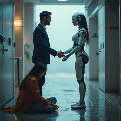 Photorealistic, futuristic core drama. A man replaces his crying human girlfriend with a graceful female android. The android has a robotic body and a perfectly human, beautiful face. The man smiles, offering his hand to the android, while the ex-girlfriend is sobbing on the floor with her bags. Cyberpunk, dramatic, emotionally charged scene, masterpiece.