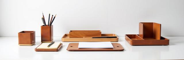 Minimalist product banner. Premium executive desk sets for managers: pen holders, document trays, organizers, and notepad holders made of leather, wood, or a combination of both. Displayed neatly on a clean surface with soft studio lighting. White or neutral background, high-resolution realistic style. Elegant, luxurious look focusing entirely on the products without distractions.