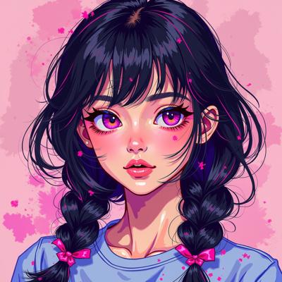 A cel shading style portrait of a white girl with perfect facial features, featuring very high saturation and contrast. She has very long double braids with pastel pink ombré black hair, a long layered fringe, and expressive hands. Her eye makeup includes pink glitter eyeshadow and Arabic eyeliner, complemented by pink glitter lipstick and long pink glitter nails. She winks playfully with her tongue sticking out. Both braids are tied with pink ribbons, and she wears a pink lace choker adorned with a pink rose. The background is black, minimal and neutral. The overall image should feel vibrant, dynamic, and stylized with a strong graphic aesthetic in a medium close-up composition.