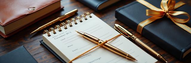 Corporate gifts banner. Premium and elegant office style with a strict professional atmosphere. Minimalist composition: high-quality notebooks with leather texture, Parker pens in elegant gift boxes, subtle metallic details (gold or silver). Discreet festive accents like a small ribbon or glossy shine. Neutral corporate background in white, gray, beige, or black tones (not limited to blue). Clean, official and premium look, minimal decorative elements, suitable for business context.