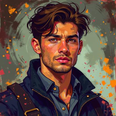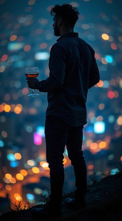 Город светящийся ночной, огни города могут быть размыты. С высок на возвышенности стоит силуэт повернутый спиной то есть мы видим только спину черные брюки, черная рубашка облегающая,чёрные ботинки силуэт мужской широкоплечий, темные короткие кудрявые волосы, в одной руке у мужчины бокал текилы, другая рука в кармане стоит уверенно прямо, Его тень, которая падает не так, как должна. тёмно-синее ночное небо, мокрый асфальт после дождя, отражающий огни города, и на его фоне — чёткий, уверенный силуэт человека, который наблюдает за своим королевством.