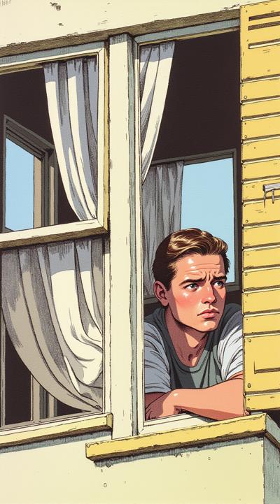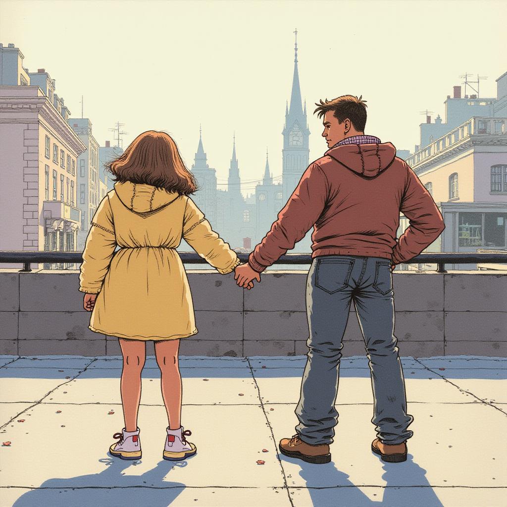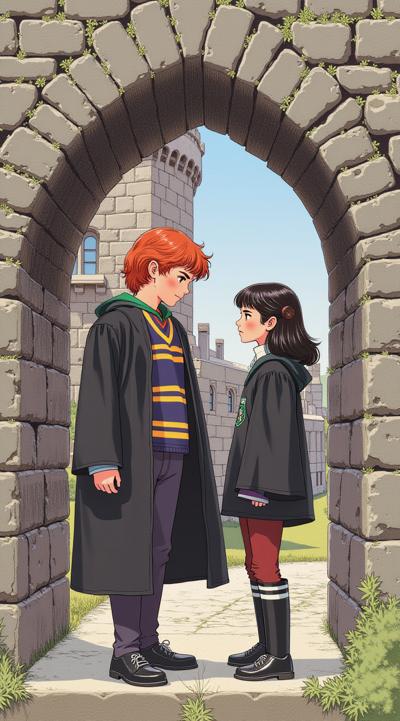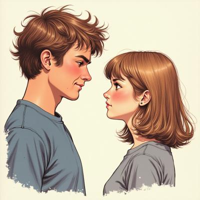 Парень и девушка стоят друг напротив друга. Парень - симпатичный, высокий, возраст 20 лет, волосы густые, светло-русого цвета. Девушка - миловидной внешности, возрастом 18 лет, русого цвета волосы. Парень с усмешкой смотрит на девушку, а девушка смотрит на парня влюблённым взглядом. На фоне - летний вечер. Изобразить в жанре молодёжный любовный роман.