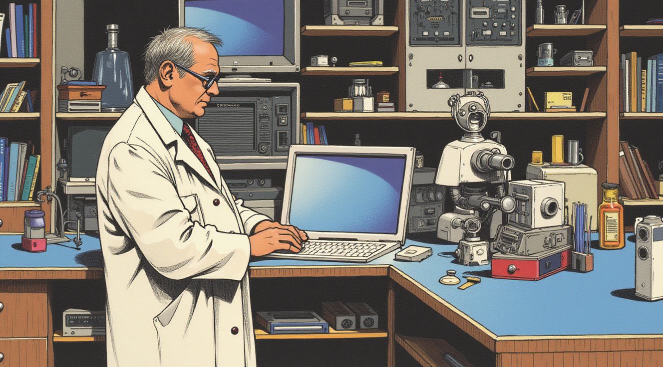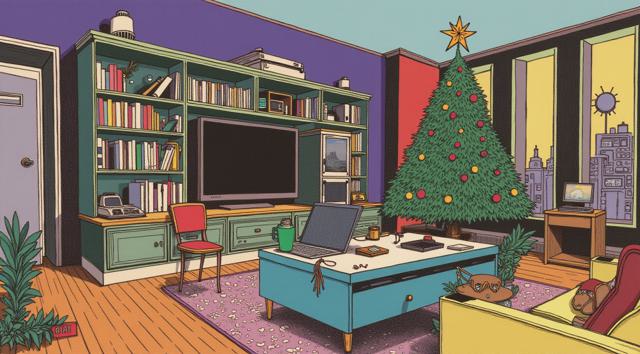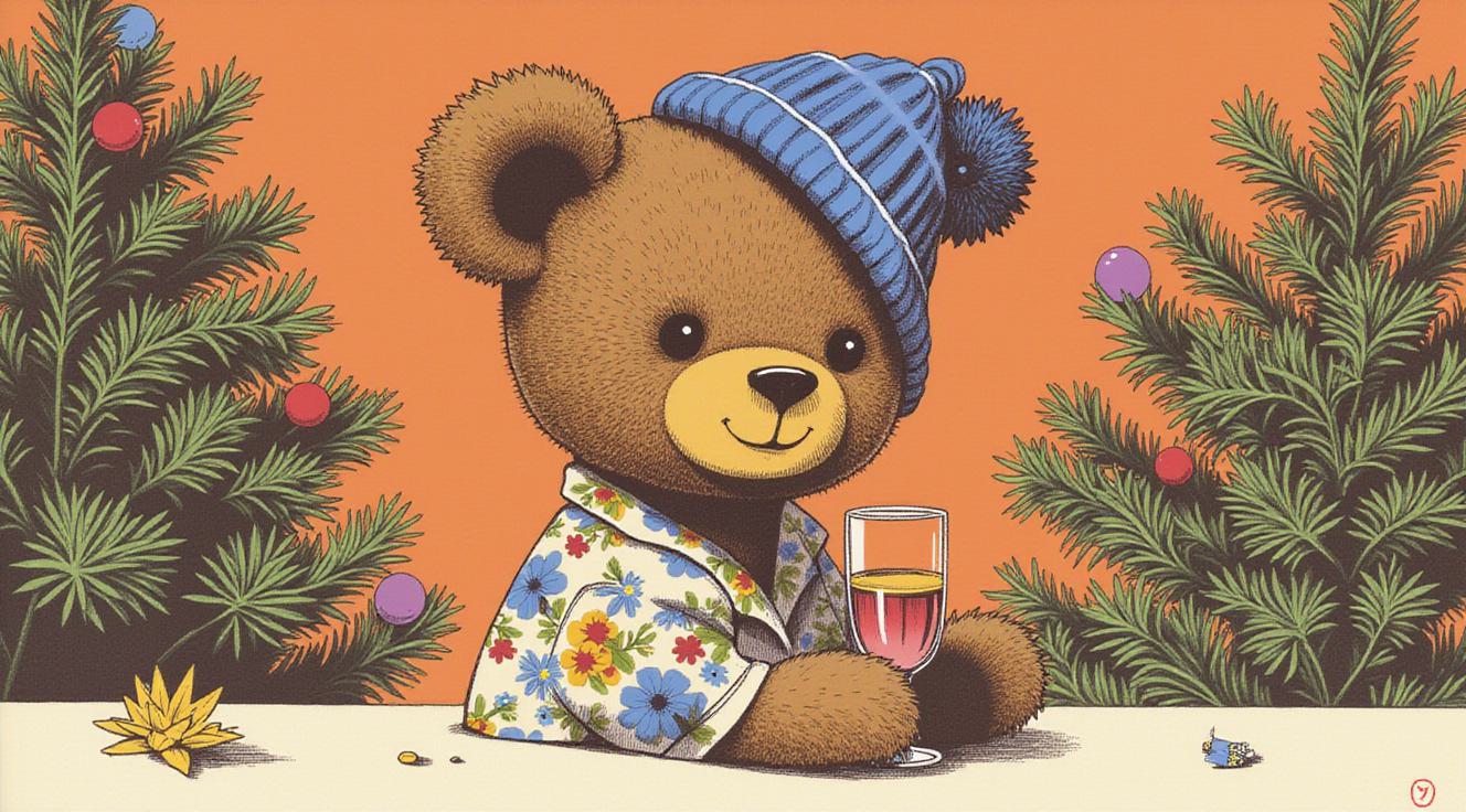 Vintage mid-century poster-style flat-vector illustration of a teddy bear wearing a blue New Year’s knit hat and a bright Hawaiian shirt, standing beside a decorated Christmas tree and holding a champagne flute; limited warm brown and terracotta palette, flat vector shapes, high-contrast silhouettes and bold simplified features, posterized shadows and minimal detail, subtle paper-grain texture, angular composition with balanced negative space, strong graphic outlines