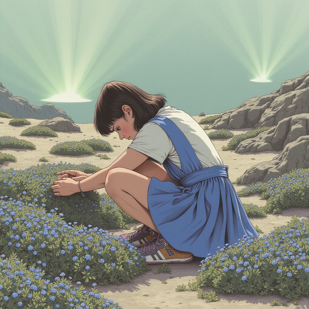A girl, 23 years old, slightly hunched over, head bowed slightly. Her hands are resting on her knees, holding a pair of forget-me-not flowers. She is sitting on a bare rock. The surrounding area is deserted. Fog with green flashes is visible in the background. A couple of rays of light break through the thick clouds, illuminating the girl's body. A couple of rays hit her face. The girl's gaze is directed into the distance, with a hint of sadness. Her hands are completely covered in blood, as are her clothes. A forest fire is visible in the background, emitting thick clouds of smoke.
