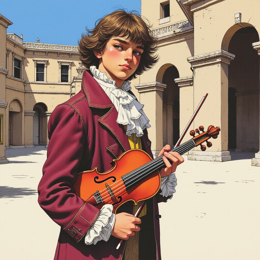 Молодой мужчина в лавандовом костюме и белой рубашке и накинутым поверх золотом халате в японском стиле и с деревеннями индийскими браслетами на руках с золотыми кудрявыми длинными волосами лежит на полу. На полу персидский ковер. Вокруг обрыки газет и бумаг, письма и осколки стекла. Команта в стиле барокко фиолетовых тонов.