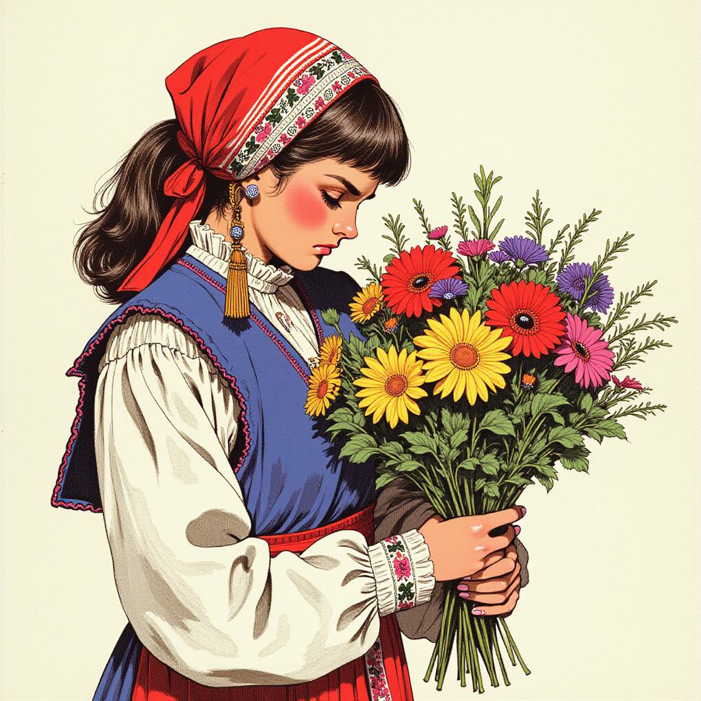 Символическая черно белая гравюра, разделённая на два плана. Драматический контраст близкого жеста и далёкого разрушения., Передний план:, Женская рука (тонкая, с изящными, но напряжёнными пальцами) держит цветок на стебле. Цветок горит. , Задний план: силуэты горящих домов. Не детальные, а размытые, как кошмар обрушенные крыши, остовы башен., Высококонтрастная гравюра. Только чистый чёрный, белый и агрессивная штриховка.