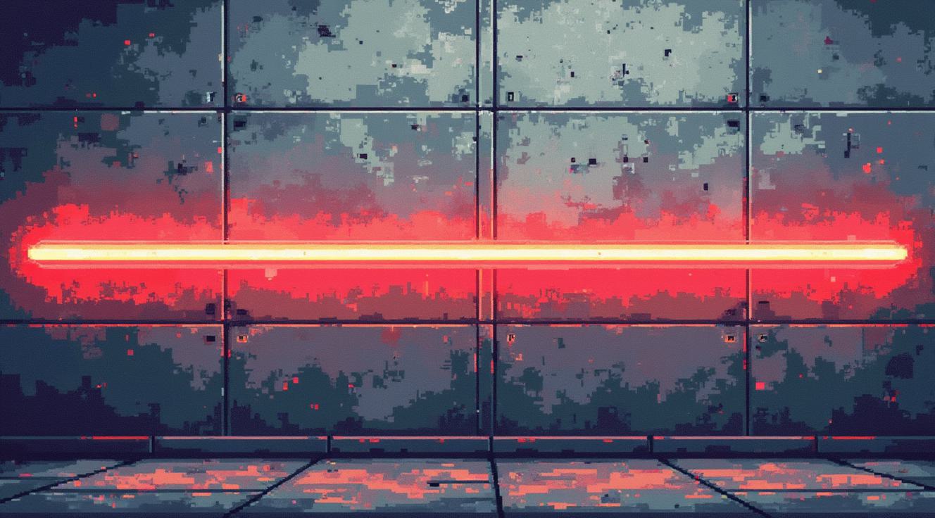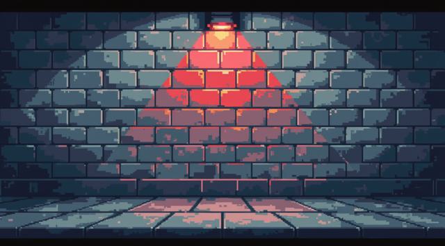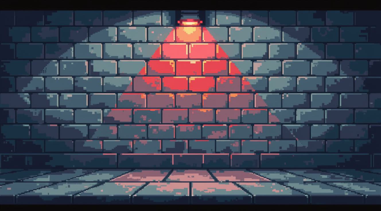 PSX style low poly concrete wall close-up, flat frontal view, no perspective depth, rough gray бетон texture, low resolution pixelated surface, dithering, minimal geometry, rotating red emergency light casting moving horizontal light band across wall, harsh shadows, VHS noise, scanlines, slight chromatic aberration, dark moody atmosphere, retro horror tone, 16:9, empty scene, no characters