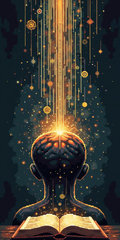 Визуализируй концепцию "кода доступа к подсознанию" через метафору архитектуры мозга. Передний план: открытая книга, из страниц которой исходит мягкий золотистый свет. Свет трансформируется в тонкие линии и символы, напоминающие двоичный код или древние руны, которые втекают в силуэт человеческой головы. Внутри силуэта — трехэтажное здание: темный фундамент (рептильный мозг), теплый светящийся первый этаж (лимбика) и легкая полупрозрачная мансарда (неокортекс). Код проникает именно в нижние этажи, минуя верхний. Цветовая гамма: глубокий синий, золото, фиолетовый. Стиль: метафорический сюрреализм, чистый, без лишних деталей. Передать идею: слово становится ключом к древним механизмам.