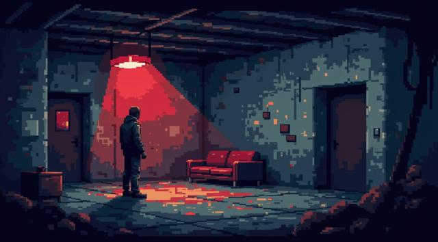 PSX style low poly concrete wall close-up, flat frontal view, no perspective depth, rough gray бетон texture, low resolution pixelated surface, dithering, minimal geometry, red emergency light casting on a background, harsh shadows, VHS noise, scanlines, slight chromatic aberration, dark moody atmosphere, retro horror tone, 16:9, empty scene, no characters